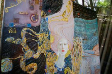 Vibrant and dynamic abstract paintings featuring intricate patterns, textures, and human figures. These paintings are a fusion of colors and shapes, creating a visually captivating experience.